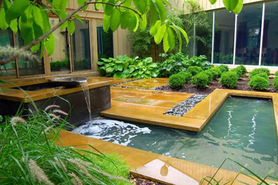 在这个小别墅花园的中间,水流从特制的铜碗流出,与L形状的水池汇聚到一起。周边的植物分别是黄杨木、玉簪花、白银莲花、黑竹以及草本植物。