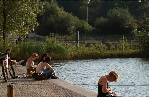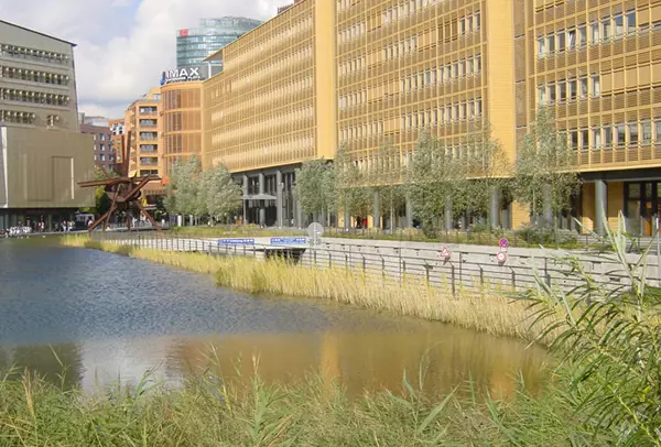绿化屋顶和非绿化屋顶的结合设计可以获取全年降雨量。雨水从建筑屋顶流下,作为冲厕、灌溉和消防用水。过量的雨水则可以流入户外水景的水池和水渠之中,为城市生活增色添彩。植被净化群落融入到整个景观设计之中用以过滤和循环流经街道和步道的水质、水体,而无任何化学净水制剂的使用。湖水水质很好,为动植物创造了一个自然的栖息场所。同时,由于净化雨水的再利用,也使得建筑内部净水使用量得以减少。在这里,城市生活、杰出的建筑创作和魅力的水景实现了和谐统一。