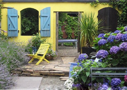 刷满了石灰水的石筑白墙、褐红色的陶罐及地面铺装、浓绿树木、深蓝色的海洋与蓝天、与鲜红或粉红的花组织出地中海庭园的强列的色彩。