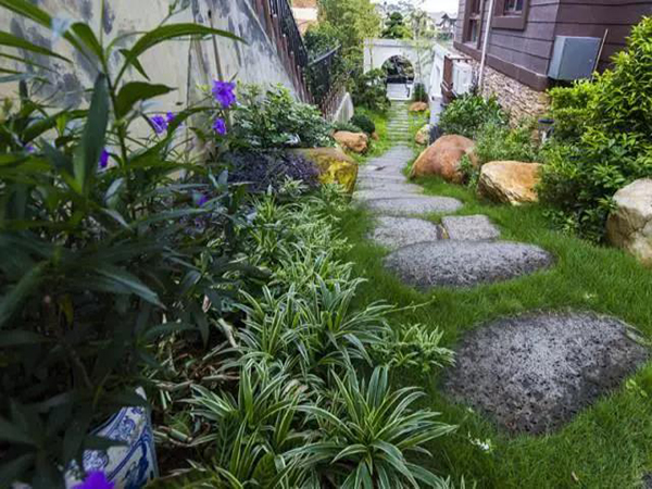 别墅花园前后院的通道上,青砖或青石板铺就的道路,边上冒出绿油油的小草,爬上可爱的青苔,小路外墙边上种上几株翠竹,绿色植物为主,其他色彩植物点缀,不失单调。远远望着,似幽幽丛林小路,阻隔着外面的繁杂喧嚷,带着点点禅意。走在这一条小路上,内心一定是平静的。