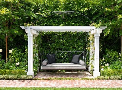 在很多人的童年记忆中,秋千都承载了太多的美好记忆,铁艺+原木+柔软布艺打造出的精致秋千,搭配上周围高大的灌木以及清新的植物,就能让人在家也能轻松感受到郊外的自在风情。