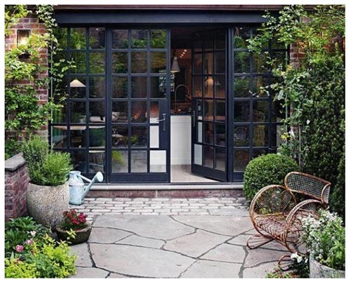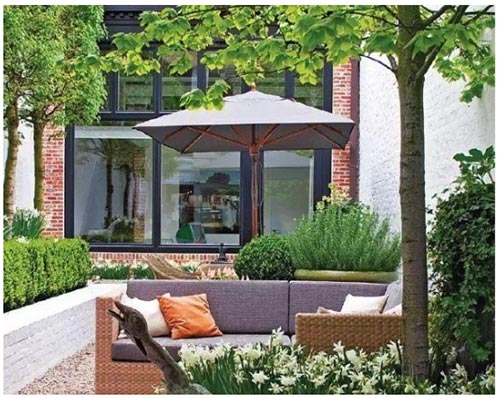 这种处于围合空间内的庭院被建筑物或高墙包围,阳光会不可避免地被遮挡。因此最好选择耐阴或半阴植物,如大叶黄杨、天目琼花、玉簪等适合这类区域的花卉植物。空间中阳光充足的部分可以种植色彩鲜艳的宿根花卉或果树等,但建议优先考虑人的活动空间,如设置用餐区或沙发休息室,在这些区域都划分清楚之后再考虑种植区域和其他一些景观的布置。