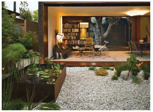 高墙庭院结构会给人一种压迫感。可以在四周种植爬攀植物,如向上攀岩的藤蔓会起到一定的缓解作用。最好的方法是将周围的墙壁涂成白色或浅色,这样不仅可以使视觉效果更大,还可以提高采光效果。同时,在庭院的四个角落种植植物可以起到模糊空间边界的作用,使角落过渡看起来更舒服。因为围合感可以让人感到安全和放松,所以一些室内活动可以延伸到庭院,如用餐、晒日光浴甚至读书工作等。在空间布局方面,设置足够的休息桌椅是非常重要的。将房间的一些元素移到外面是个好主意,比如餐桌、壁炉、沙发等等可以放置在庭院中,用餐或者工作时都可以有一个不同的环境也会产生不同的心境。