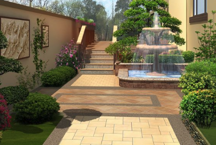 ①大门内与正门前:两门之间一条小道是必需的,因此,路的形状和路面的艺术感便是中心,关键是要看住宅建筑主体的风格和院落的大小。比如,欧式豪宅宜配色调相应的拼花路面,有的还可以在屋前设置水景。如果是中式或日式院落则两门之间的路以曲折式为多,配以影壁徊廊,以避两门相对。路面可做成小鹅卵石虎皮花纹,或是草坪汀步等。如果是比较前卫的现代风格宅院,就要在点和线、色调和造型上做文章,在所有的方面都要与整体风格相吻合。总之,围绕着两门之间有很多文章可做。