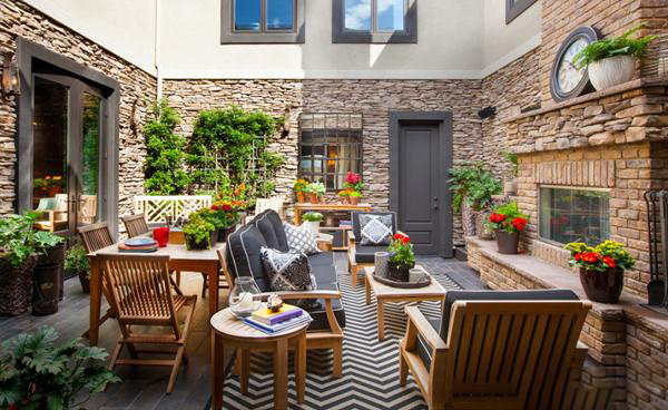 地面采用大地色仿古砖打造直观的土地即视感,在中庭四周墙角种植或高或矮的绿植,或者用仿古的铁艺花架布置一些有型的盆栽绿植。中间留出足够的活动空间,可以保持空旷也可以设计休闲桌椅。墙面开着不规则的三角形窗户了,大玻璃的落地造型简洁又带感。