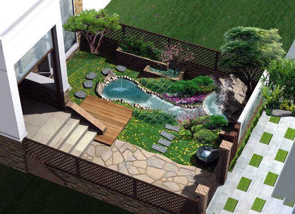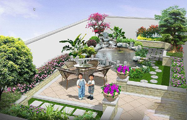 郁郁葱葱的树木环绕着中式个性的花园别墅,丰富的层次感让个性的别墅花园设计生动形象,生机勃勃的绿色植物在呼唤着生命的活力,别致的实木凉亭隐约的伫立在丛林中,优雅的小巧妆点出悠扬的水池,灵动的鱼儿为私家花园别墅带来生气。