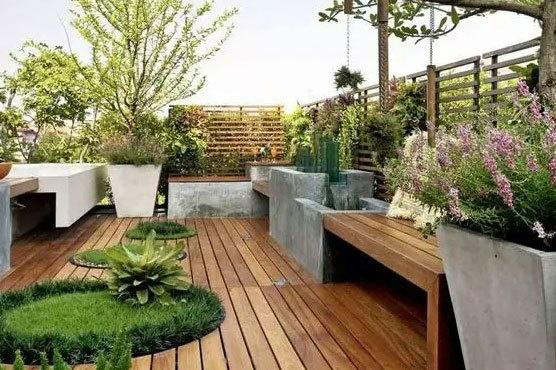 防腐木也是室外装饰的重要材料,脚感非常舒适,经过特殊处理的木材使用寿命也较长。不仅地面可以采用防腐木来装饰,甚至可以用它来搭建长椅、小亭子等,带来别具一格的别墅小花园。