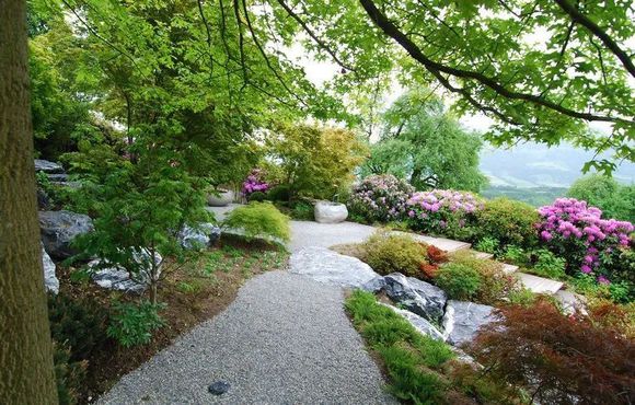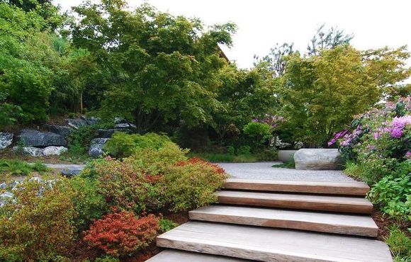 不同品种的日本枫树创造了叶子形状,叶子颜色和秋天着色的多样性。用竹子种植的框架与开花的杜鹃花和杜鹃花相辅相成。草,苔藓,蕨类植物和葬礼完成种植。砂岩碗里的红豆杉盆景在花园的背景中提供了一个有价值的观点。