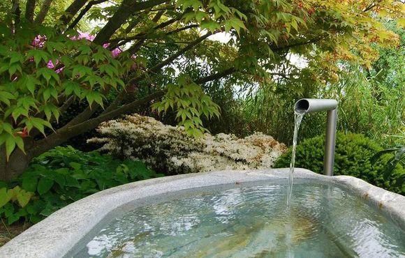 干燥的小溪从房屋顶部蜿蜒流向座位。它的花朵以纯白色调绽放,象征着水。关于一个巨大的,形成野生木楼梯,你进入上面的花园院子里。从外面看不到庭院,但仍然可以欣赏到山谷的景色。砾石处提供放松和平静的空间。竹叶在风中的沙沙作响和喷泉的微妙飞溅完成了花园的画面。