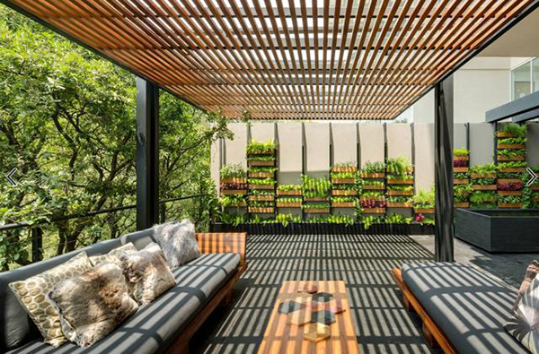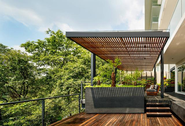 今天为大家带来的别墅花园案例是一个坐落在山顶上的别墅花园,做在花园里可以俯瞰山下的美景,坐拥日出日落的美好时光,整个小花园被绿树环抱,植物的绿色与防腐木的木色搭配,色彩和谐鲜丽,再用黑色做了中间的色彩调和,成为了完美的色彩组合,花园中还有一个比较特别的笛梵,墙面上设计了花盆,整个墙面看上去就是一面植物墙,种植了许多花草,一眼望去美丽至极。