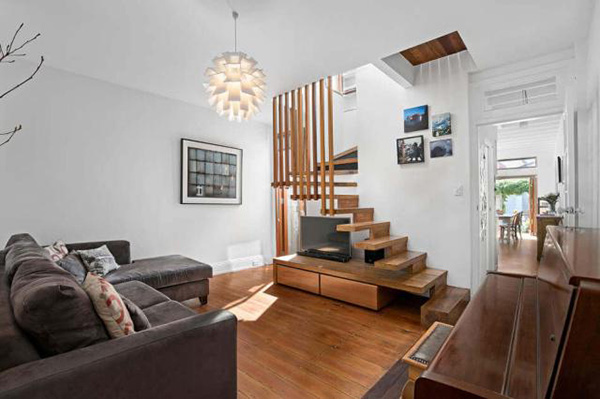 客厅空间正好与通向二楼的楼梯挨着,电视墙是客厅的设计亮点,巧妙地与楼梯结合在一起,利用木格栅和楼梯做了一面电视墙,既充分利用了楼梯下方的空间,又将楼梯形成了一个精致的立面效果,丰富了楼梯功能和效果,客厅放了简洁的真皮沙发,黑色质感,大气婉约,搭配吊顶的吊灯,让客厅效果更加生动。顺楼梯而上就是卧室空间。