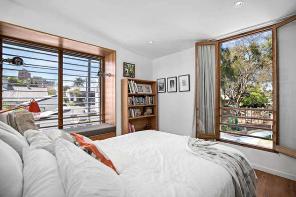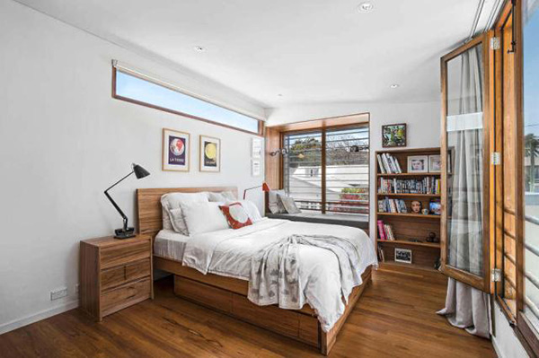 二楼卧室的设计简洁明亮,多以木质材料为主,木床、木地板、书架,同样的色调搭配,让卧室倍感温馨。二楼是在一楼的基础上改造过的,增加楼板重塑空间,卧室的窗口设计很有特点,比如床头墙上的长方形玻璃窗,既有设计感又增加了卧室的采光亮度。