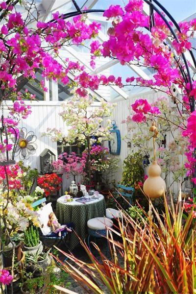 据陈莹莹说:别墅室内有200㎡,花园有140㎡,有3个花园,前花园30㎡,北面的后花园有100㎡,楼顶还有一个花园有13㎡,是做的阳光房,是一个三角梅花房(如上图),所有的花园布置和对于花的选择都是陈莹莹一个人完成的,看着如同仙境一般。