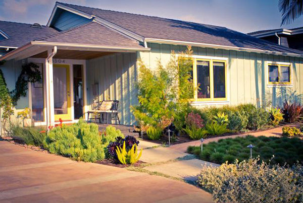 房子旁边生长着淡绿色的葛缕梅叶,下面种植着明亮的黄绿色狐尾蕨类植物,它们的叶子上点缀着石灰金色的门窗装饰。窄叶蓝色粉笔棒和银色地毯种植在浇筑的混凝土铺路机之间,与蓝绿色外墙涂料有关。深紫色的多肉植物和火热增添了兴趣和多样性。