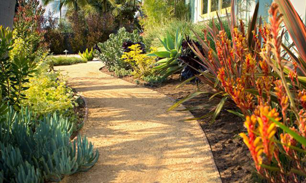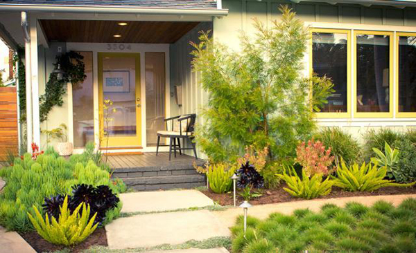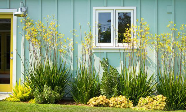 mark延续了前院的种植主题,用耐旱的多年生植物和五颜六色的多肉植物作为边界。车库新刷成蓝绿色的一面作为袋鼠爪子黄色花朵尖刺的背景,前面是狐尾蕨类植物。