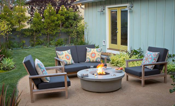 就在后面的门廊外,是一座已经腐烂的花岗岩露台,长约16英尺,宽16英尺,将屋前和后院的硬质景观材料连接在一起。房主们选择了柚木家具、无烟火坑和彩色抱枕,这些都与房子的外部油漆颜色相辅相成。“在一个美丽的夜晚,打开法国式的大门,点燃火坑,这太棒了。它真的把我们吸引到了外面,”麦克马洪说。
