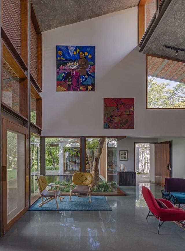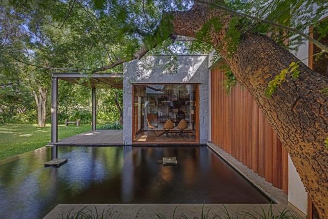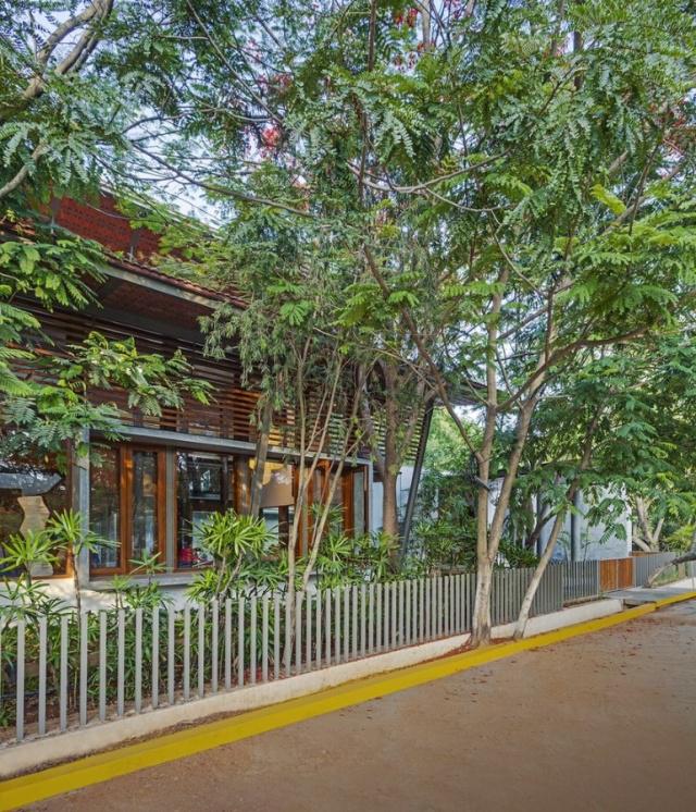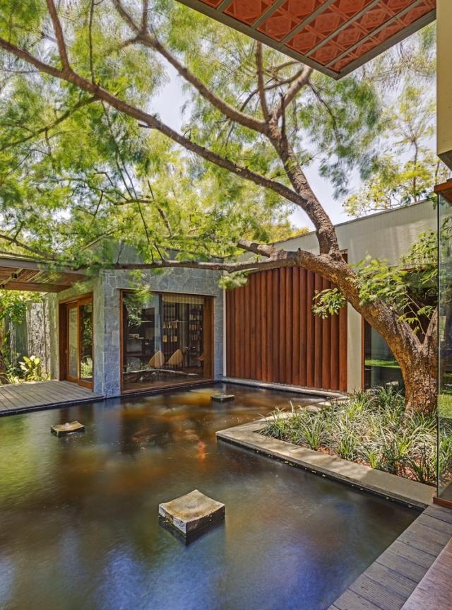 建筑中间种植了一棵大树,刚好在鱼池的边上,景色非常好看