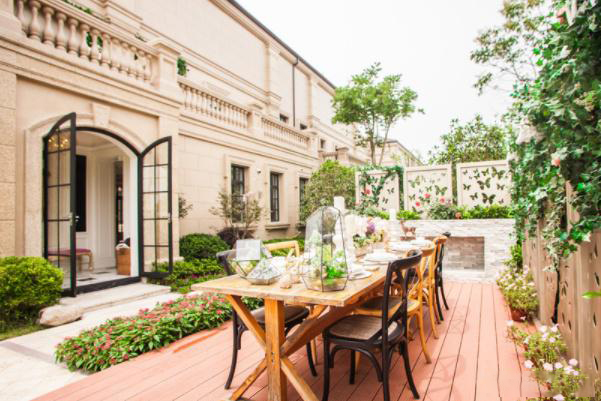 在别墅的花园中间,设计一个露天休闲区,摆放一张长长的餐桌,可以用来和朋友们聚餐使用。围墙使用木质栅栏,文艺又清新。在栅栏上面种植一些爬墙的植物,蔓延在围栏上面,过长的直接垂下来,十分惬意。在花园的另一处的长廊,是一片青青的草地,鲜花和植物长得十分茂盛,可以在夏天的夜晚漫步于花园中乘凉。