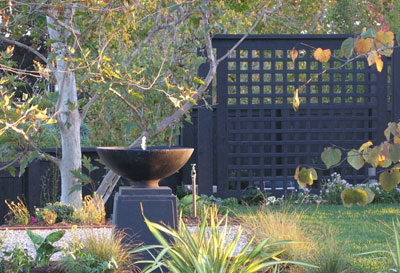 深色铺装。使用黑色或深灰色作为路径和庭院的表面给人以庄严的设计。在这个例子中,对空间的中心而言,墨黑色鹅卵石海滩的硬景观元素有助于吸引眼球。