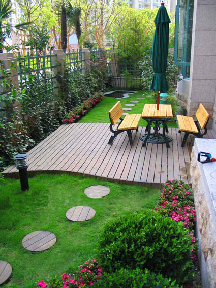 现代家庭住房中,不少底层房屋都有一个大到30~50平方米,小到20~30平方米的别墅庭院,人们都喜欢种树栽草、堆山叠石、造水景、水车、小型喷水池,使它们有山野之趣,再摆些小桌凳或树阳伞,创造一个休闲、舒适的宁静环境。