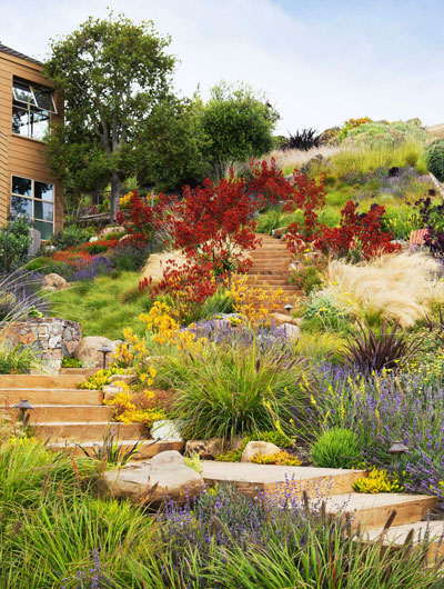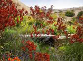 如此美丽的港湾全景会引领着住户继续深入,沿着一条陡峭的坡道到达住宅。住宅旁边是一片公共区域,这里是一片大面积的草地。实际上,在该住宅施工阶段的初期,构筑物的基坑建造地不太合理,导致防水性不强,横向坡度的梯度也失去了它本身的作用,最终使住宅的下层区域不是那么坚固稳定,从而对整个住宅本身都有损害。多年以后,这些损害被人们重新发现,该设计团队希望对一些不合理的地方进行改造,重新修复排水系统中存在的一些问题,并对修复的地基做好保护工作,为整个家庭创造一个可使用的空间。该设计团队对整个场地作为了一个总体规划,他们设计了一个形状弯曲的沼泽地,沼泽地覆盖了斜坡,这样的设计也切断了横向流动的水流,将之引向住宅,从而创造了一条浪漫的人行小路,沿着小路可以到达一个随意休闲的座位区,途中还会经过一个池水区。场地中还种有许多植物,它们皆来自加利福尼亚当地,所有的植物都处在低水位的地区,抗旱能力很强。
