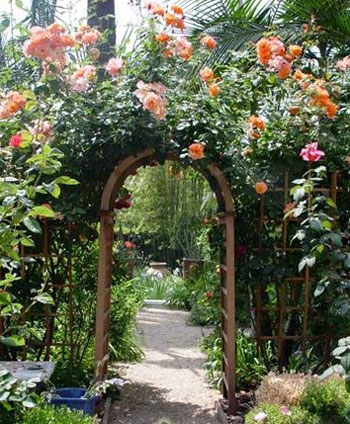 凉棚是另一个常见的装饰结构。在现代乡村别墅花园里,木质或铁质的弯曲凉棚有种欢迎来客的效果。根据需要,可以安装一个简易的大门与凉棚搭配。在凉棚上种植一些开花类的攀援植物,有一种鲜亮的感觉。而且,凉棚还可以增加花园的高度,或区分出一些独立的空间。