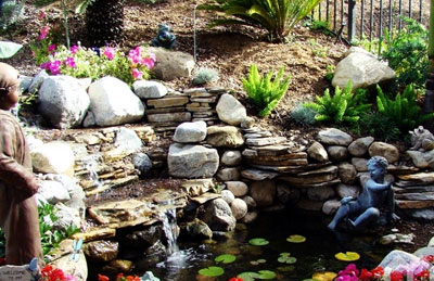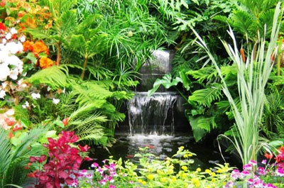 水生植物是水面上一道亮丽的装饰品,但它们的根系并非直接触及池底,这样池底就不会有太多的淤泥。同时,如果在池塘中撒一些珊瑚,它们就也可以防止淤泥的产生。为了实现水循环,水景瀑布花园通常需要一种电力水泵来不断的更新池塘内的水。水泵可以放在池塘内,也可以隐藏在池塘周围的建筑之中。当然,最好是隐藏在池塘周围的建筑之中,这样不影响花园的整体美观。