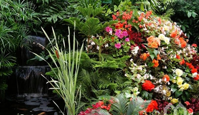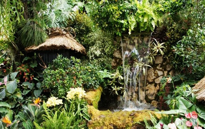 为了能够营造出别具一格的外观,各种各样的水生植物都可以用来组成水景瀑布花园的装饰元素。此外,还以在池塘的周围种上其它色彩斑斓的鲜花,以此来烘托出池塘一片生机盎然的迷人景色。此外,各式各样的石头、茅草建筑都可以用来装点水景瀑布花园,为其增添一份清新自然的景色。