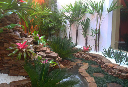 由假山和植物构建而成的园林,给人带来了热带雨林的感觉,鲜艳的花朵搭配浓浓的绿,好一幅绝美景致。