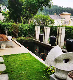 别墅庭院的石头装置应多采用人工材料的硬质景观如雕塑、石刻、木刻、盆景、喷泉、假山等,再利用绿化、水体造型的软质景观,相互兼顾,透过整个庭院景观来体现深厚的文化内涵。